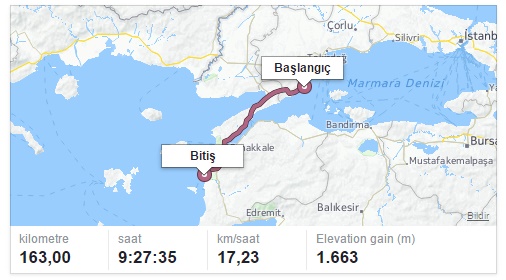 İkinci günümüzde 163 kilometre bisiklet sürdük, toplam 1,663 metre tırmanış yaptık, Şarköy’den çıkarken 326 metre rakım gördük, ortalama hız 17,2, maksimum hız 60,5 olmak üzere toplamda 9 saat 27 dakika bisiklet üstünde kaldık. Dizim biraz daha fazla ağrıyor, kıçım don kesiği nedeniyle ağlıyordu, ben ağlıyordum…