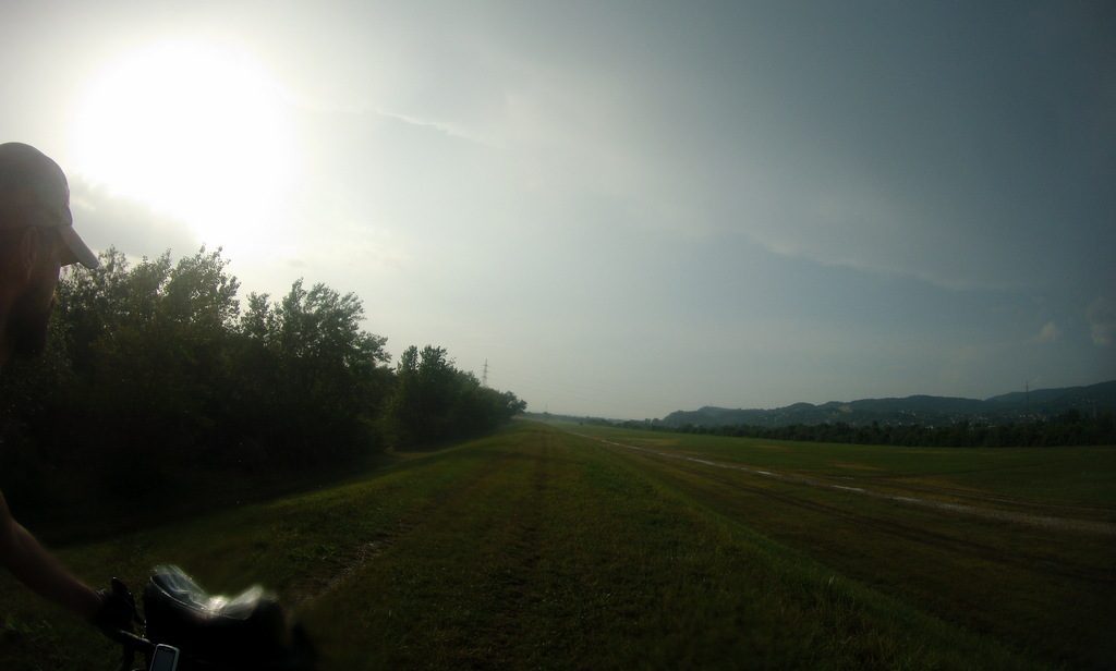 Zagreb mafya gibi. Bir kere girersen bir daha çıkamazsın diyor resmen. Baya uzun sürdü şehir merkezinden çıkabilmem. Bir çok kez saçma ara sokaklara girdim, bir çok kez yanlış yollara girdim. Garmin’de ısrarla bana şehir turu attırma gayretinde. Ona uymayıp kendi yoluma bakayım dedim o da olmadı. Baya saçma bir şekilde uzun süreli mücadele yaşadıktan sonra normalde bisiklet sürmenin yasak olduğu bir otoyol kenarında, bisiklet yolu bularak şehirden çıkabildim. Bu yolu takip edince sınır kapısına ulaşılabiliyor olduğunu görünce baya sevinmiştim ama bir süre sonra bisiklet yolu bitti ve ben dımdızlak kaldım otoban kenarında. Bir yandan da efsane bir yağmur yağıyor tabi. Öyle yağıyor ki, sanırsın biri yukarıdan hortum tutuyor. Ne varsa soyundum, çıplak sürdüm yağmur dinene kadar. Bir şekilde tarlaların arasında bir yol bulup, oradan başka bir yola bağlandım. Ana yoldaki sınır kapısını kullanamayacağım için, bu yolun sonundaki sınıra doğru devam etmeye karar verdim.